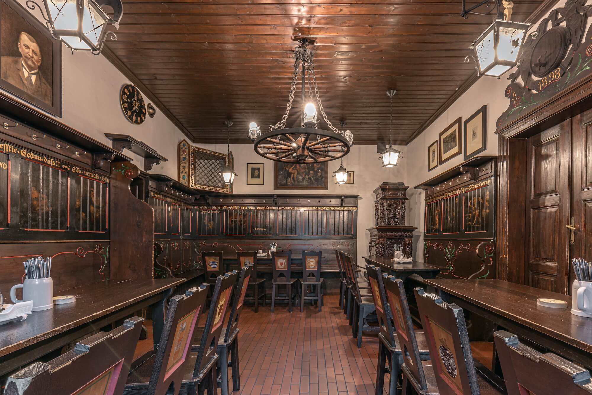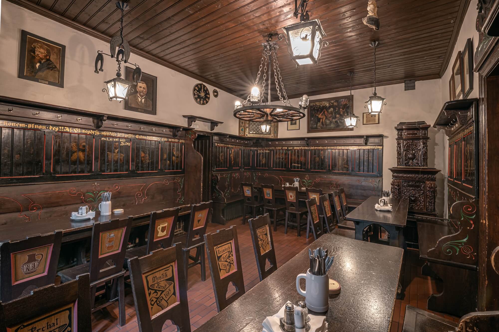 The smallest, but also the most famous hall of our restaurant. Wood panelled walls are decorated with ancient guests‘ paintings. A remarkable throne covered with leather dominates the room. You can further see several portraits of celebrities. The hall offers 30 seats.