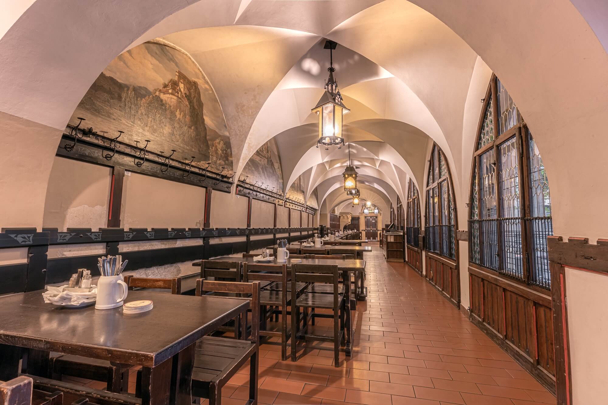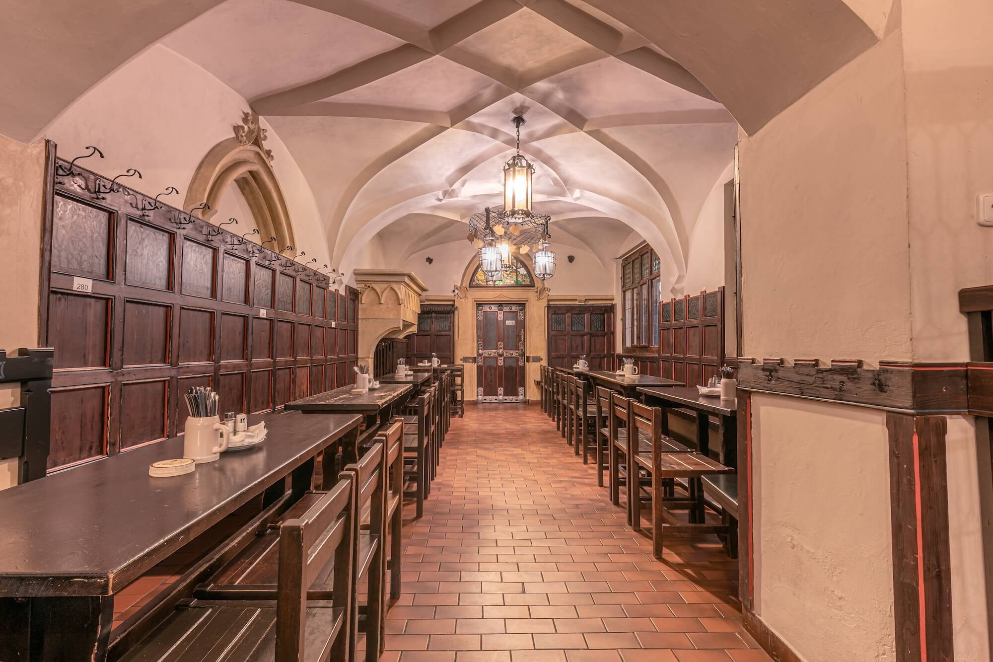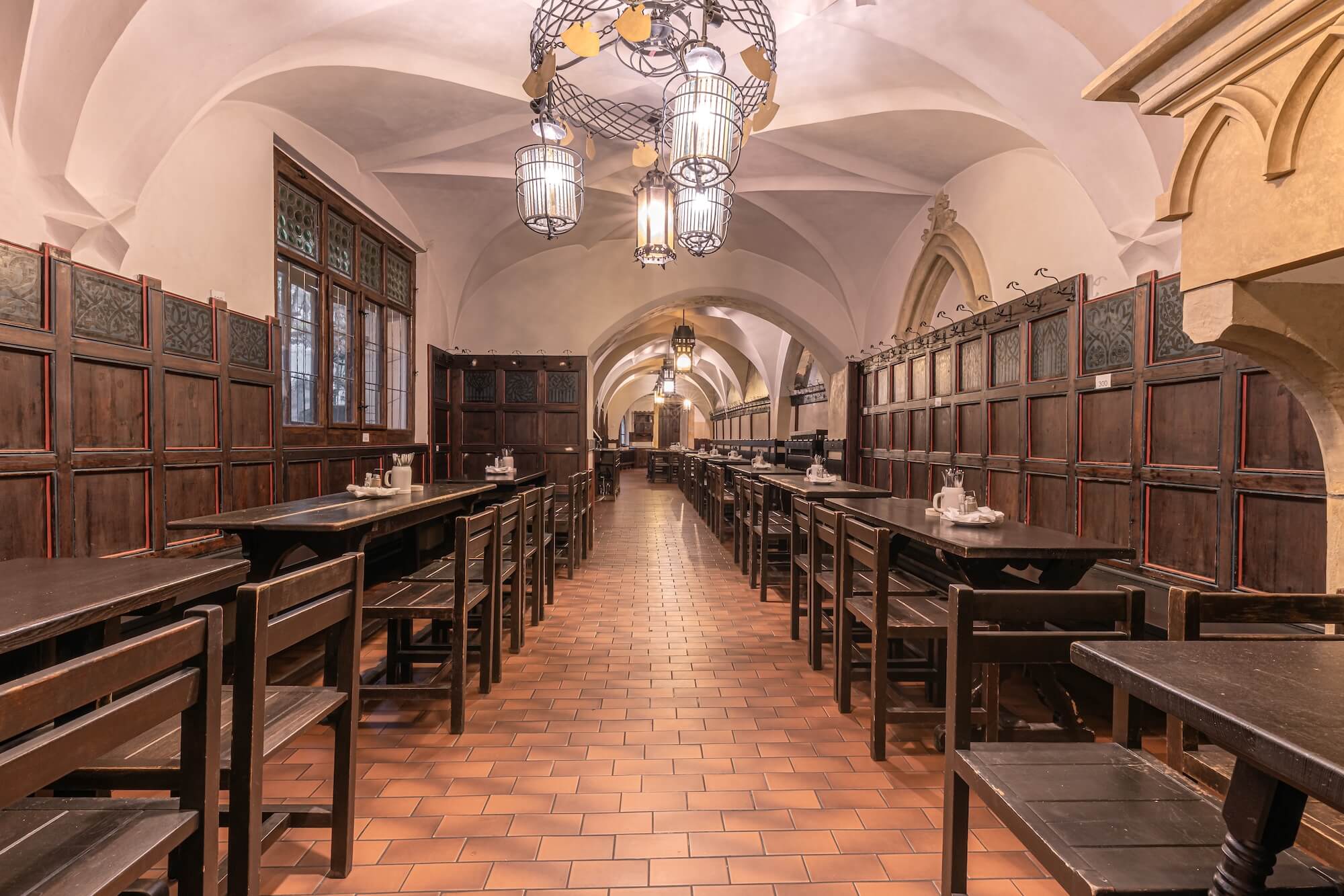 This long and narrow hall with five gothic arches and a diamond vault used to be a porch connected with the garden. It is now separated from the garden by large windows. The unique atmosphere is strengthened by lights shaped like medieval towers. The hall offers 85 seats.